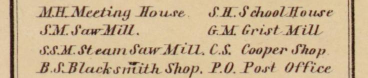 Familysearch.org is the main website we use for genealogy research. Links to historical books and maps from the 1840s – 1920s are posted at the bottom of their respective county pages and can be located through our County Pages Index. The books and maps contain useful information pertaining to the people and land attached to many of the treasure legends. Old maps also pinpointed businesses and public buildings that may have long since disappeared. The key pictured below was generally used for most maps published prior to 1900. In the mid to late 1800s, Ohio atlas makers also used symbols to pinpoint businesses and tiny drawings of churches and schools.